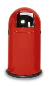 Abfallbehälter, Inhalt 22 l, Höhe x Durchmesser 640 x 355 mm, Push-Klappe Öffnung manuell, Innenbehälter aus Stahl verzinkt, Korpus aus Stahl verzinkt mit Pulverbeschichtung in silber, Deckel aus Edelstahl poliert, Unterbau Kunststoff-Bodenring.
