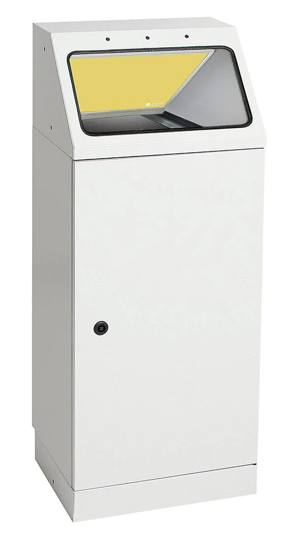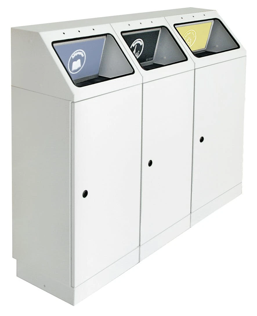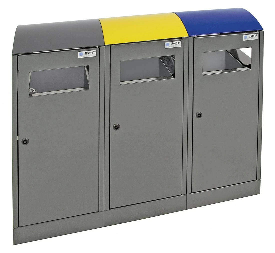 3-fach Station, Abfallsammler zur Wandbefestigung.Wandaufhängung erforderlich. Die Sammler sind aus vollständig verzinktem Qualitätsstahlblech gefertigt und hochwertig strukturiert pulverbeschichtet. Im Behälterinnern sorgen die Innenbehälter aus ebenfalls verzinktem Stahlblech für optimale Abfallaufnahme. Das Fassungsvermögen beträgt 3×45 Liter. Die Abfälle werden durch eine frontseitig eingelassene und per Vierkantschloss verschließbare Flügeltüre entnommen (Vierkantschlüssel wird mitgeliefert). Die Einwurfklappen schließen verzögert und somit geräuschlos, wirken feuer- und geruchshemmend. Zur farblichen Kennzeichnung der Einwurfklappen liegen den Sammlern drei Sets mit drei ProPads (= protect-pads, hochrobust, selbstklebend) in den Farben blau, gelb und anthrazit bei. So entscheidet der Anwender selbst, welche Kennzeichnungsfarbe der Sammler tragen soll. Die Behälter werden vollständig in Deutschland gefertigt und sind TÜV/GS geprüft. Der Hersteller gewährt eine Garantie von 5 Jahren. Außerdem sind die Behälter zertifiziert selbstlöschend und als nicht brennbar eingestuft (gem. DIN 4102, Brandschutzklasse A1). Farbgebung Korpus: lichtgrau RAL 7035, Farbgebung Einwurfklappen: ProPads