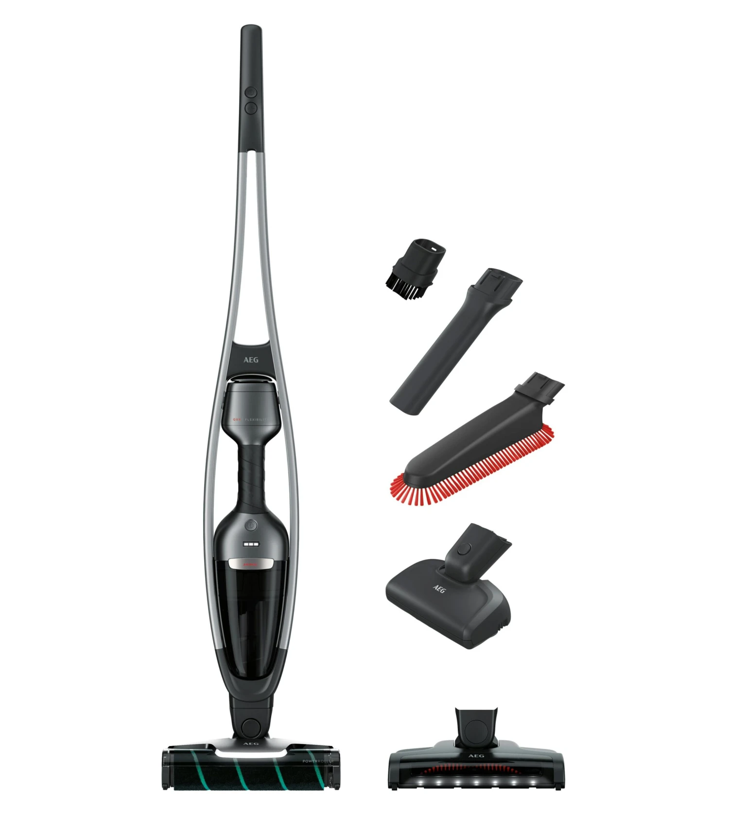 AEG QX9. Staubbehälter Typ: Beutellos, Produktfarbe: Schwarz, Grau, Staubkapazität: 0,3 l. Reinigungsart: Trocken, Vakuum-Luftfilterung: Zyklonal, Schmutztrennungsmethode: Zyklonal. Energiequelle: Akku, Batterietechnologie: Lithium-Ion (Li-Ion), Batteriespannung: 25,2 V