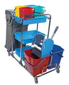 CleanSV® SPL verchromter Putzwagen mit Moppresse, 2 Körben und 2 Plastikeimern je 20 l