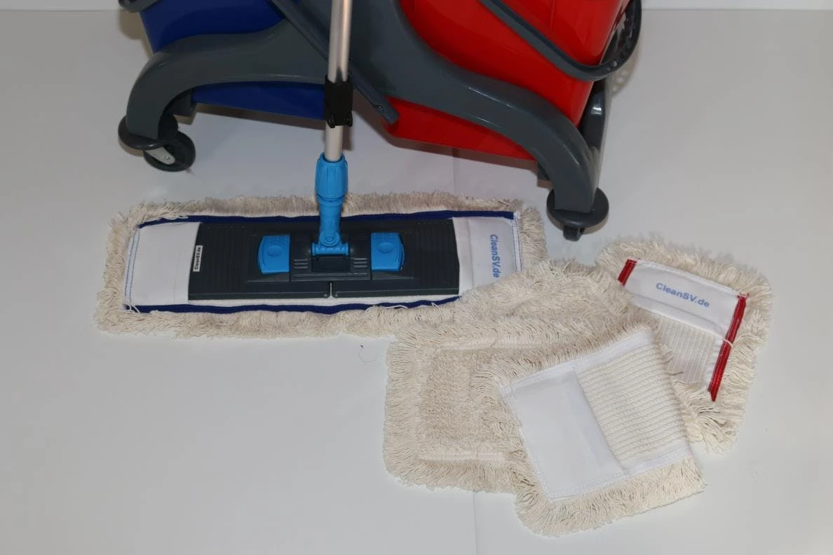CleanSV Wischset Kunststoff- Doppelfahrwagen mit Presse, Mop Set 40 cm: bestehend aus 3 Baumwollmop / Wischmop 40 cm, einen 40 cm Klapphalter mit Telekopstiel