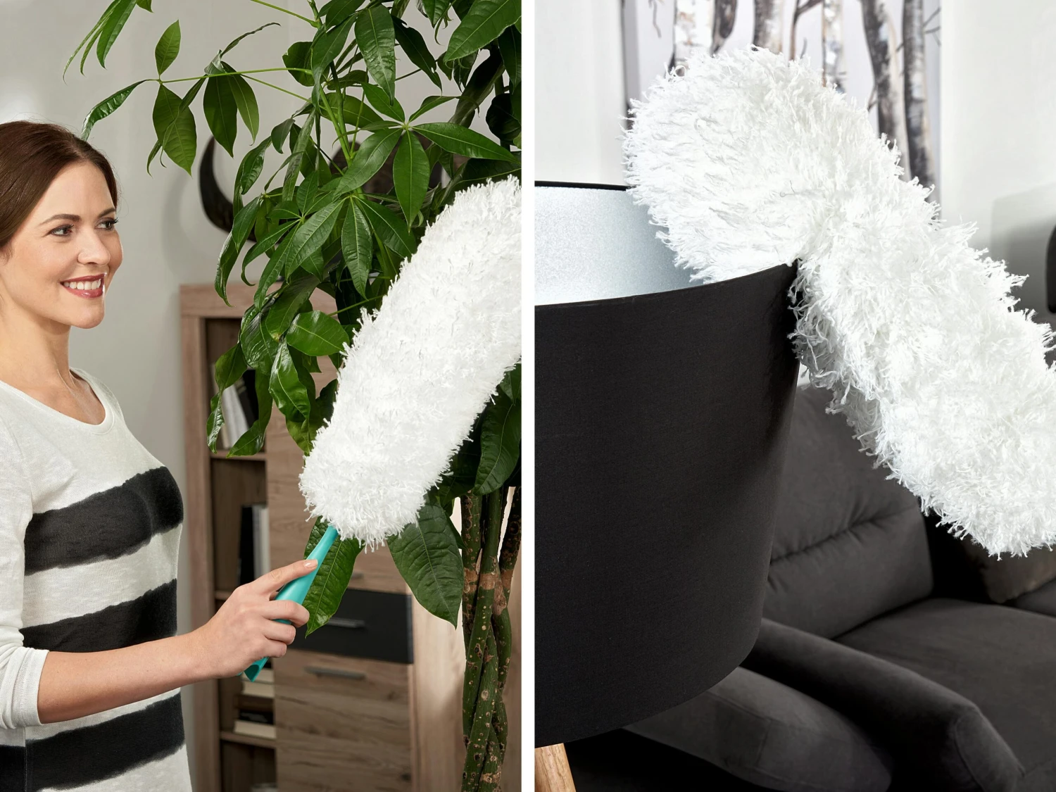 Staubfrei in wenigen Sekunden: für den Staubwedel Duster XL ein Kinderspiel, denn er nimmt selbst feinsten Staub kinderleicht auf. Die superdichten Mikrofasern binden den Staub und verhindern so, dass Staubpartikel nur aufgewirbelt werden und sich an anderer Stelle wieder niederlassen. Seine streichelweichen Fasern gleiten dabei in jede Ritze und in jede Unebenheit. Sie befreien Zimmerpflanzen ebenso zuverlässig vom Staub wie Bücherregale und Jalousien. Auch über hochempfindliche Oberflächen wie Computer- und Fernsehbildschirme gleitet der Duster XL sanft und schonend hinweg. Der Duster XL besitzt eine extra lange Reinigungsfläche von 38 cm, die ideal ist zum Reinigen von großen und glatten Oberflächen wie Tischflächen oder Bildschirme. Der Griff ermöglicht die Nutzung eines Leifheit Click-System-Stiels mit Teleskopfunktion, bei dessen Einsatz der Duster XL bis in entfernte Zimmerecken reicht. Mit Aufhängemöglichkeit zum praktischen Verstauen. Zur Reinigung den Staubwedel unter fließendem Wasser mit Seife gut ausspülen. Hierbei sollte kein Weichspüler verwendet werden.