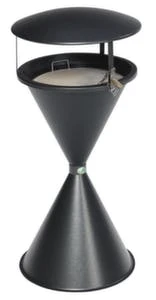 Standascher, Höhe x Durchmesser 960 x 440 mm, aus Stahl, Korpus verzinkt mit Pulverbeschichtung in antiksilber, Eieruhrform, mit herausnehmbarem Kippensieb, Behälter mit Kette als Diebstahlsicherung, mit Schutzdach, verschließbar mit Vorhängeschloss, mit Bodenronde zur Bodenverankerung, Lieferung inklusive Montagematerial.