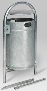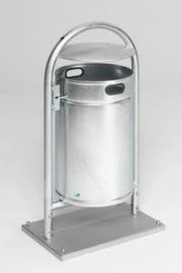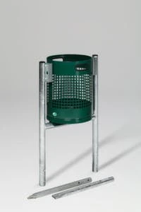 Rohrbogenständer, für den Außenbereich geeignet, Inhalt 30 l, Höhe x Breite x Tiefe 1150 x 490 x 400 mm, Deckel aus Stahl in silber, Wandkonstruktion gelocht, Korpus aus Stahl verzinkt mit Pulverbeschichtung in moosgrün, Gestell aus Stahl verzinkt in silber.