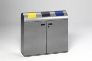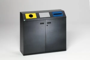Wertstoffsammelstation, Inhalt 3 x 80 l, Höhe x Breite x Tiefe 975 x 1080 x 375 mm, mit 2 Einsätze mit Stanzung, 1 Einwurfklappe, Einsätze fest montiert, Einwurfklappe selbstschließend, Innenbehälter aus Stahl, einfache Entleerung über Doppel-Flügeltür, verschließbar mit Doppelbartschloss, Korpus aus Stahl mit Pulverbeschichtung in antiksilber, Deckel aus Stahl mit Pulverbeschichtung in RAL1023/silber/RAL5010, Unterbau Kantenschutz und Höhenausgleichsfüße.