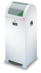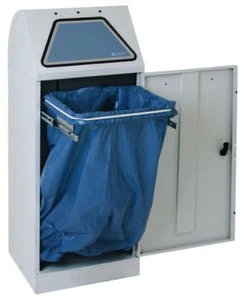 Wertstoffbehälter, nicht brennbar, Inhalt 1 x 45 l, Höhe x Breite x Tiefe 800 x 400 x 380 mm, Einwurfklappe Öffnung manuell, selbstschließend, ausziehbarer Klemmring zur Sackbefestigung, einfache Entleerung über Tür, verschließbar mit Vierkantschloss, Korpus aus Stahl verzinkt mit Pulverbeschichtung in RAL7035 Lichtgrau, Deckel aus Stahl in RAL7035 Lichtgrau, Lieferumfang inkl. Aufkleber zur Wertstofftrennung, geprüft gemäß DIN 4102 BK A1.