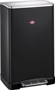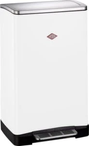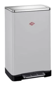 Abfallbehälter, Inhalt 2 x 18 l, Höhe x Breite x Tiefe 650 x 405 x 345 mm, Klappdeckel Öffnung mit Fußpedal, schließt gedämpft durch Soft-Close-Funktion, mit 2 Einwurföffnung(en), Fixiervorrichtung zur Sackbefestigung, Innenbehälter aus Kunststoff in schwarz, einfache Entleerung über herausziehbaren Innenbehälter, Korpus aus Stahl mit Pulverbeschichtung in rot, Deckel aus Edelstahl.